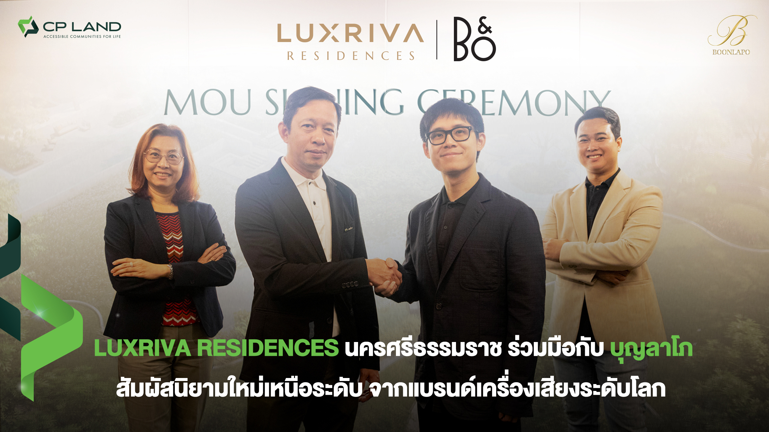 นายทรงพล บุญลาโภ ประธานกรรมการบริหาร บริษัท บุญลาโภ จำกัด ผู้นำเข้าและจัดจำหน่ายแบรนด์เครื่องเสียงชั้นนำระดับโลก กล่าวว่า รู้สึกตื่นเต้นและยินดีเป็นอย่างมาก ที่ได้ร่วมเป็นพาร์ทเนอร์กับ LUXRIVA RESIDENCES นครศรีธรรมราช ภายใต้ CP LAND ซึ่งถือเป็นโครงการแรกที่ได้มีความร่วมมือนี้ขึ้น นับเป็นโอกาสอันดีของทางบุญลาโภ ที่ได้ร่วมส่งต่อสิทธิประโยชน์ และความเหนือระดับให้แก่ลูกบ้านของ CP LAND ที่ถือเป็นกลุ่มเป้าหมายเดียวกับบุญลาโภ เป็นการขยายฐานลูกค้าไปในส่วนภูมิภาคและภาคใต้ โดยเฉพาะกลุ่มเป้าหมายที่มีกำลังซื้อสูง (High-Net-Worth Individuals) กลุ่มผู้ประกอบการท้องถิ่นที่ประสบความสำเร็จ หรือ Local Achiever และกลุ่มลูกค้าลักซ์ชัวรีภูมิภาค จังหวัดใกล้เคียง ตอบโจทย์ครบในทุกแบรนด์ทั้ง แบรนด์ B&O, Caviar, Cotodama, LaMetric, Cabasse, และ Pantheone